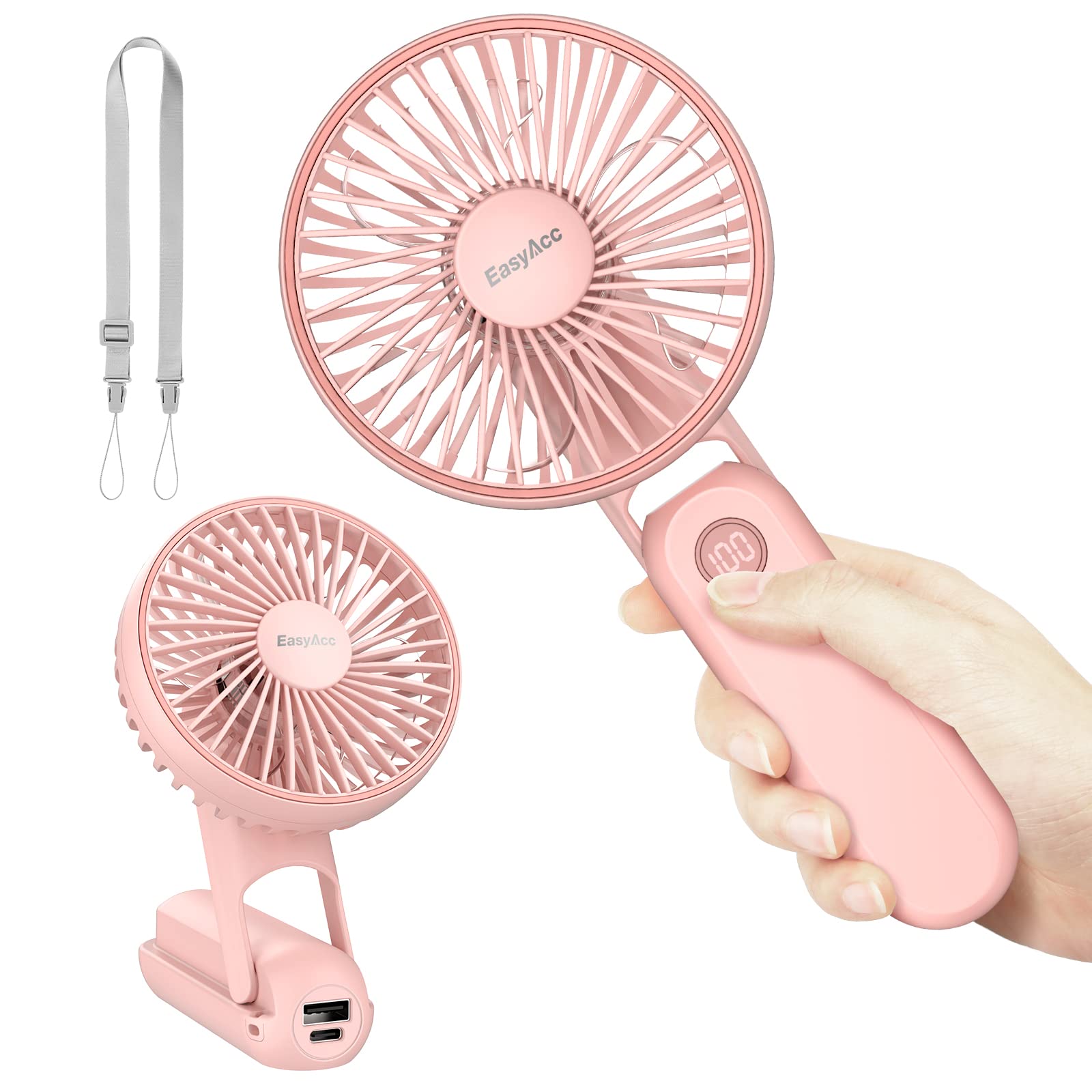 EasyAcc Portable Fan for Travel,Rechargeable Handheld Fan, 5 Speed Ultra Quiet [18H Max Cooling Time] with Backup Power Digital Display Lanyard Neck Foldable Personal Fan Hot Flashes Gift Outdoor