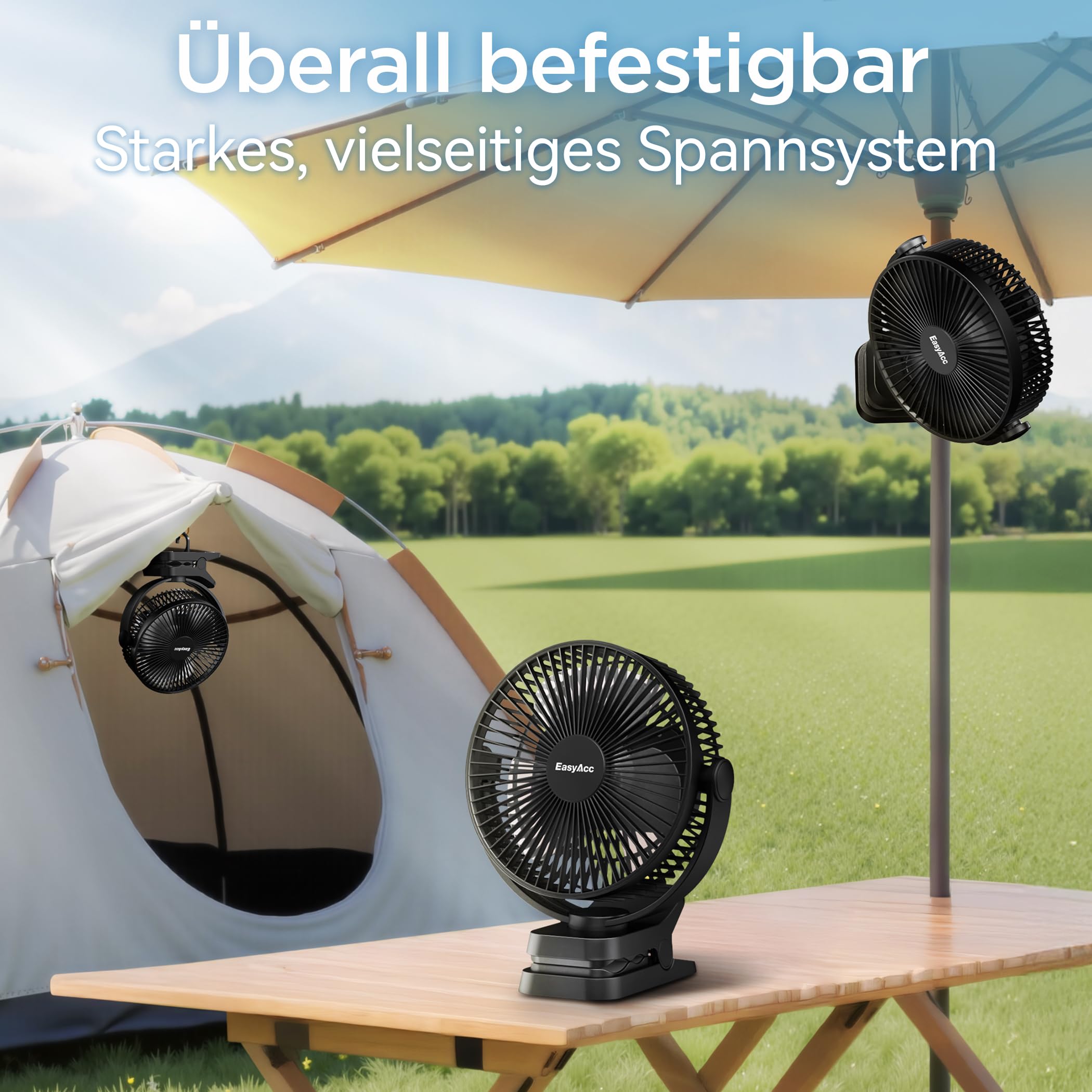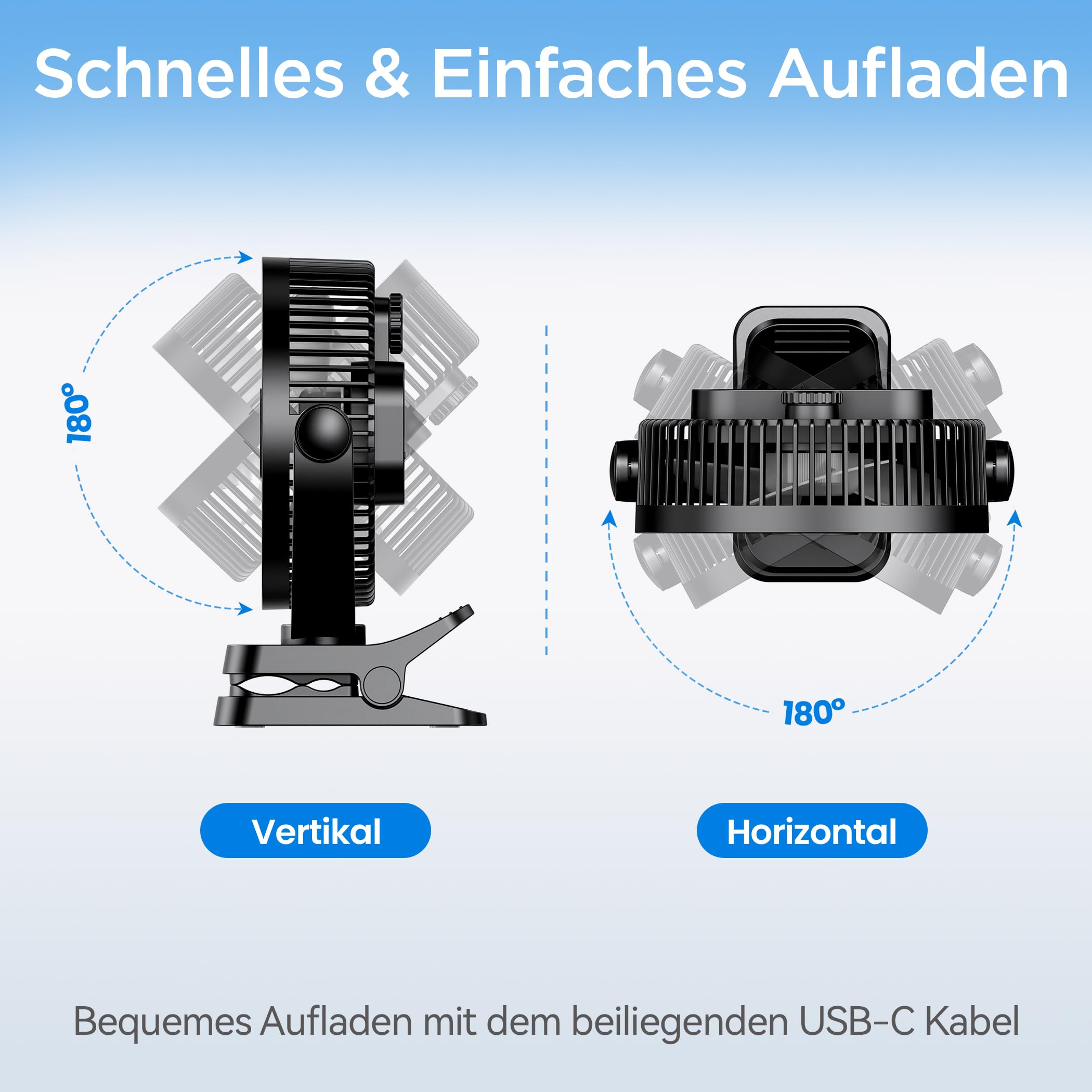 - 【3 in 1 Multi-Function Clip Fan with Sturdy Clamp】: The 3 in 1 design of 360° adjustable clip, hanging hook, and stand up allows you clip fan for golf cart rails, tent poles, camping desk, treadmill handles, or even a baby stroller. No wobbling, no slipping. Rotate the clip sideways, vertically, or upside-down to direct the breeze perfectly.