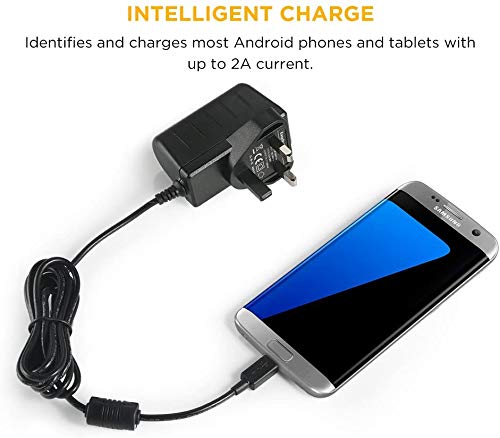 - Ultralanges Kabel mit einer Länge von bis zu 1,2 m (4 Fuß) für bequemeres Laden. 3-poliger UK-Adapter; Eingang: 100 - 240 V; Ausgang: 5 V/2 A.