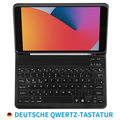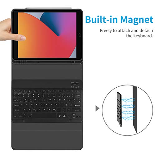- Magnetisch abnehmbare Bluethoth Tastatur: Die magnetische iPad 8/7 Tastatur ist abnehmbar und einfach zu bedienen. Ein Federmechanismus unter jeder Taste sorgt für eine taktile Reaktion bei jedem Schlag und hilft Ihnen, schneller und fehlerfreier als auf einem Touchscreen zu tippen. Mit Bluetooth erleichtert das Arbeiten und Lernen. Außerdem sieht es sauberer und einfacher aus.