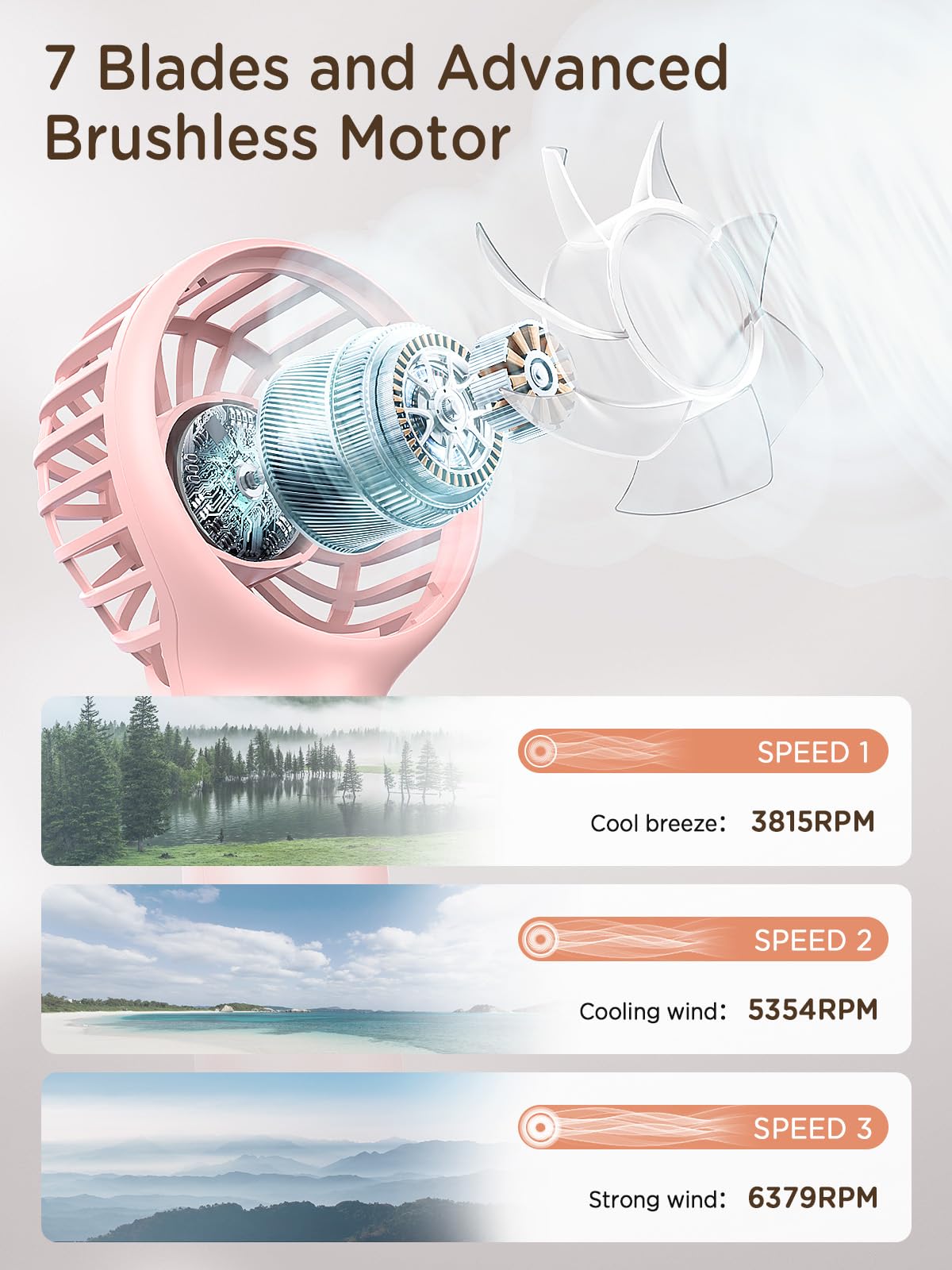 - ❄️【Strong Wind Mini Portable Fan- Upgraded 7 Fan Blades】EasyAcc mini handheld fan uses a new copper motor and 7 fan blades with fluid mechanical design, which makes the fan have sufficient power and the maximum speed reaches 6379RPM, which is far superior to other mini fans on the market. The wind brings you refreshing and coolness anytime and anywhere! It's the perfect way to cool your face at home, in the office, at the beach, at the park, at a game, camping, theme park or while traveling