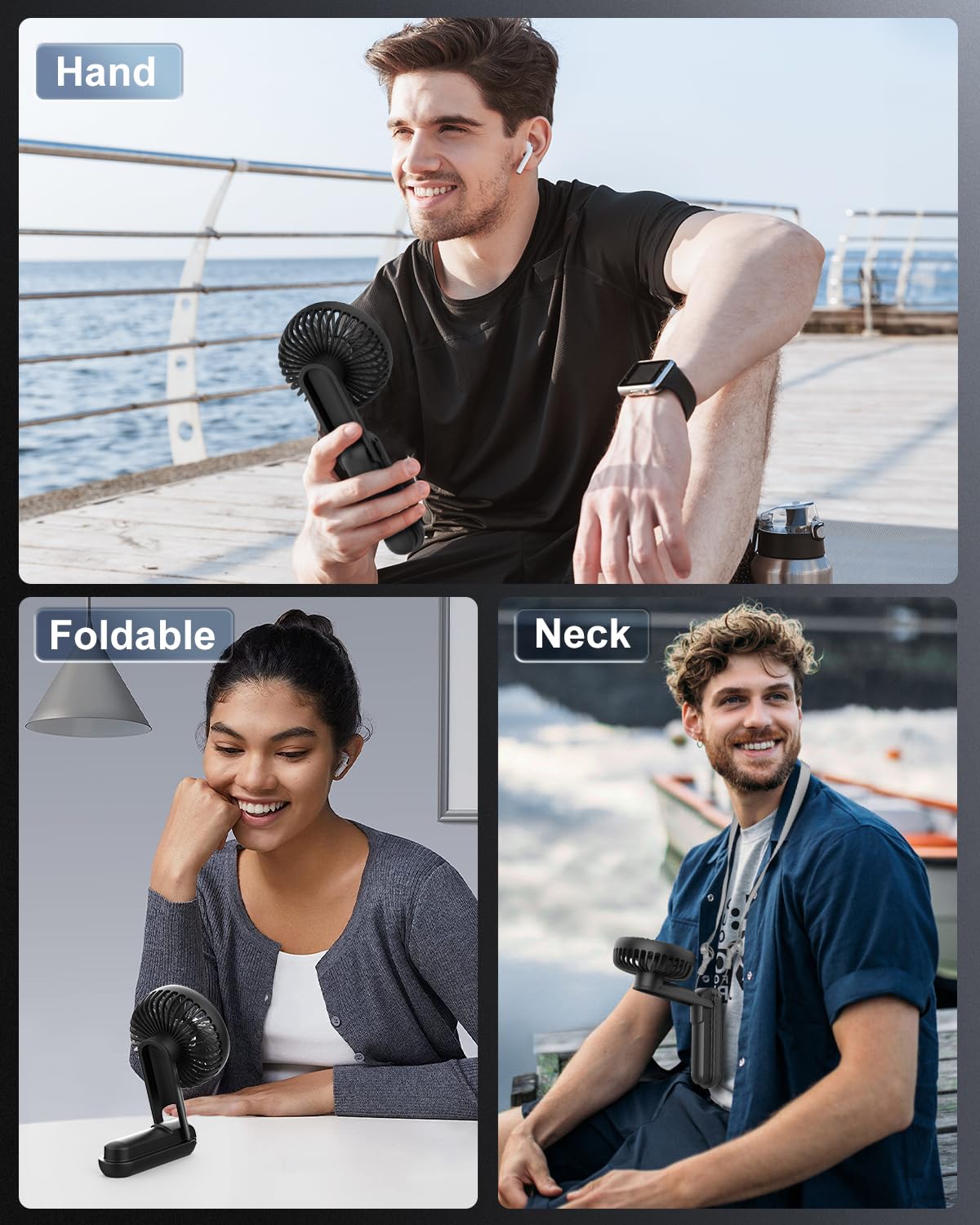 - 🏕️【Multipurpose Portable Fan】Are you dazzled by the variety of fans on the market? Then why not choose EasyAcc this multi-purpose fan? One piece to meet your various needs 👍️① Handheld fan, very convenient to take out for outsoor activities or travel. 👍️② Mini desk fan, 180° foldable, rotate it as mini desk fan. 👍️③ Neck fan, Equipped with 73.5 cm (28.9 inches) of lanyard, the fan weighs only 154 grams (0.33 lbs), easy to hang the fan on the chest, free your hands. Are you excited about such a practical multi-purpose electric fan? 💘💘💘