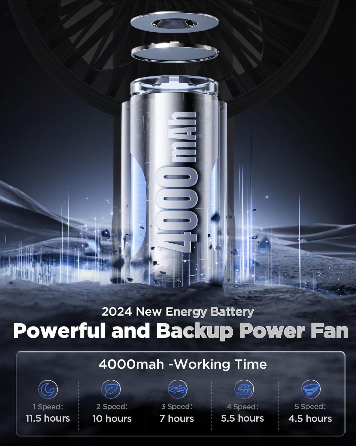 - 2024 Updated TWO💫【4000 Capacity Rechargeable Battery + Ultra Quiet 5 Speed Powerful Fan】New version portable fan, Increase into 5 speed level supporting 12 working hours, Speed 1: 3600rpm-12 hours-5db ; Speed 2: 3900rpm -10 hours - 10bd ;Speed 3: 4200rpm -7 hours - 20db; Speed 4: 4600rpm - 5.5 hours -30'; Speed 5: 4900rpm -4.5 hours-35-40db