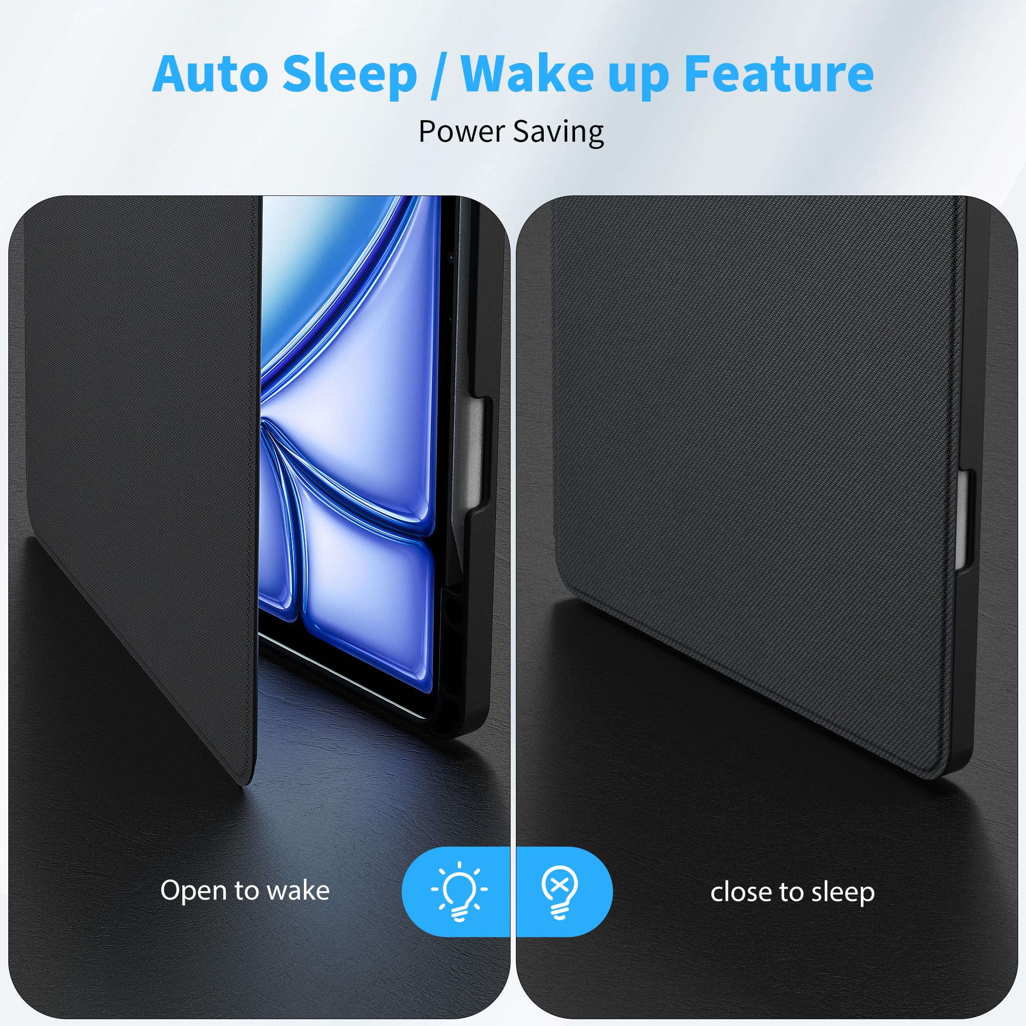 • [Auto Wake/Sleep] --- The built-in strong magnet automatically wakes up your tablet and puts it into sleep mode by turning it like a book. In addition, they allow easy opening and safe closing.